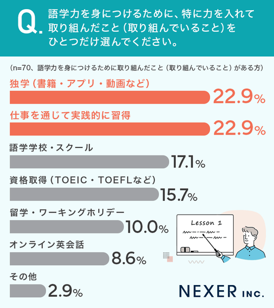 続いて「語学学校・スクール」が17.1%、「資格取得(TOEIC・TOEFLなど)」が15.7%、「留学・ワーキングホリデー」が10.0%、「オンライン英会話」が8.6%となっています。