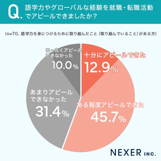続いて、語学力を身につけるための取り組みがある方に、語学力やグローバルな経験を就職・転職活動でアピールできたかを聞いてみました。