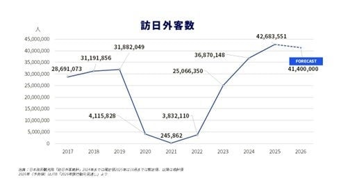 当レポートによると、2025年の訪日外国人観光客数は年間4,268万人に達し、旅行消費額も約9.45兆円(速報値)と過去最大を更新したことをはじめ、ホテル投資市場、地域別の地価上昇動向、日銀金融政策の影響など、多面的な視点で日本のホスピタリティ市場を分析しています。