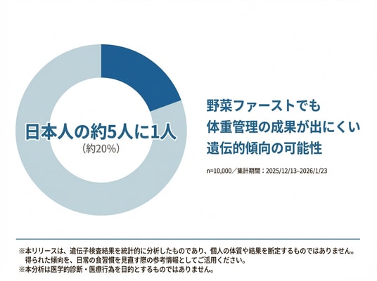 日本人の約5人に1人(約20%)は、野菜ファーストを心掛けても体重管理の面で成果が出にくい遺伝的傾向を持つ可能性