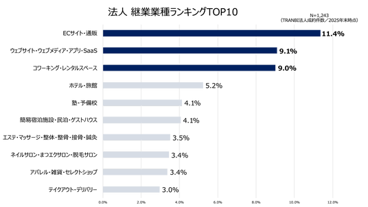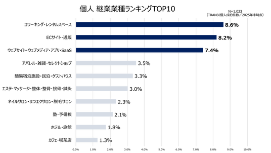 個人成約案件の業種を見ると、コワーキング・レンタルスペース、ECサイト・通販、ウェブサイト・ウェブサービスなどが上位に並びました。