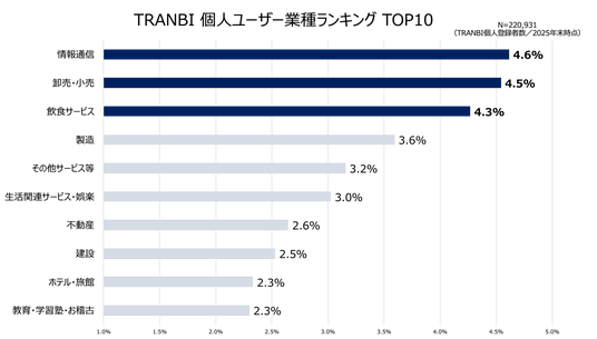 個人登録ユーザーの業種を見ると、情報通信、卸売・小売、飲食サービス、製造業などが上位に並びました。