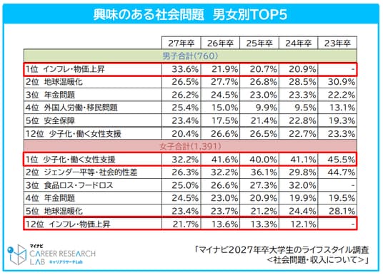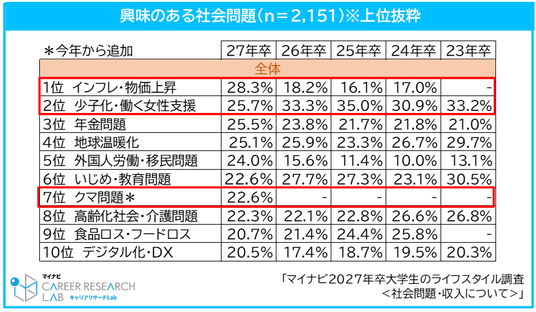 学生が興味のある社会問題1位は「インフレ・物価上昇」で前年比10.1pt。増女子学生の1位は「少子化・働く女性支援」。今年初めて「クマ問題」が7位にランクイン