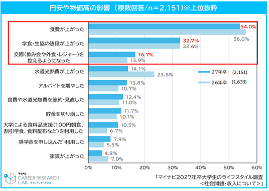 円高や物価高の影響について聞いたところ、「食費が上がった(54.0%、前年比2.0pt減)」が最多で、次いで「学食・生協の値段が上がった(32.7%、前年比0.1pt増)」、「交際(飲み会や外食・レジャー)を控えるようになった(16.7%、前年比2.8pt増)」だった。