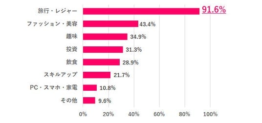 次いで「ファッション・美容」43.4%、「趣味」34.9%、「投資」31.3%と続きました。Q4で質問した実際の使い道は、「ファッション・美容」14.5%、「趣味」16.9%、「投資」18.1%で、こちらも理想と現実のギャップがみられました。