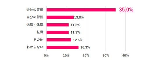 2024年と2025年の冬のボーナスに金額差があったと回答した人に要因を尋ねると、「会社の業績」が35.0%で最も多く、次いで「自分の評価」が13.8%となりました。「退職・休職」「転職」といった環境の変化によって金額が変わった人もいました。