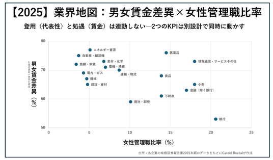 ■業界地図:女性管理職×男女賃金差異で“登用”と“処遇”の分布を俯瞰