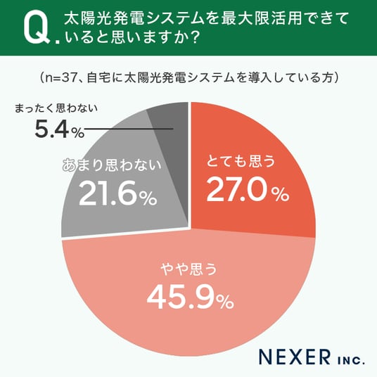 「とても思う」が27.0%、「やや思う」が45.9%となり、合わせて約73%の方が太陽光発電システムを活用できていると感じていることがわかりました。「あまり思わない」は21.6%、「まったく思わない」は5.4%という結果です。