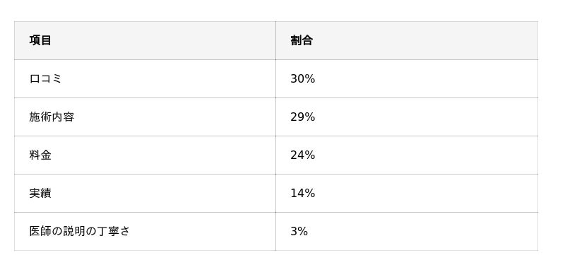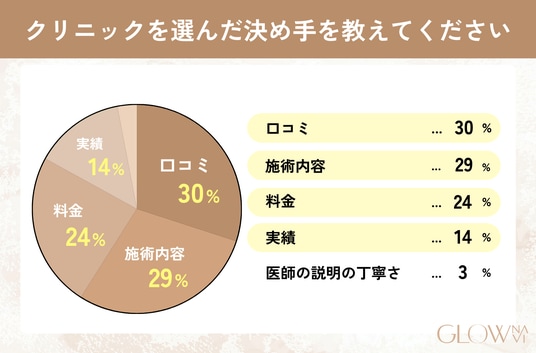 クリニックを選んだ決め手では、「口コミ」という回答が30%で最も多く集まりました。