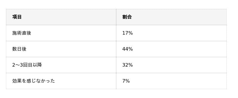 いちご鼻治療の効果を実感し始めた時期について、「数日後」という回答が44%で最も多い結果でした。