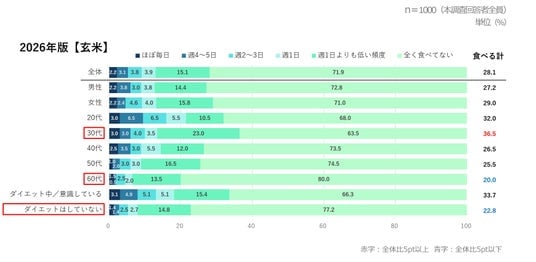 玄米の2026年版をみてみると、【30代】では「食べる計」が36.5%と全体より5pt以上高くなっている一方で、【60代】や【ダイエットはしていない層】では、食べている人が2割~2割強にとどまり、全体より5pt以上低い結果となった。