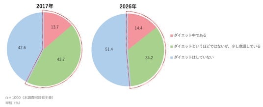 「ダイエット中である(14.4%)」は2017年と比較して0.7pt増加している一方、「ダイエットというほどではないが、少し意識している(34.2%)」は前回より9.5pt低下している。全体として【ダイエット中/意識している層】は48.6%となり、2017年から8.8ptの低下がみられた。
