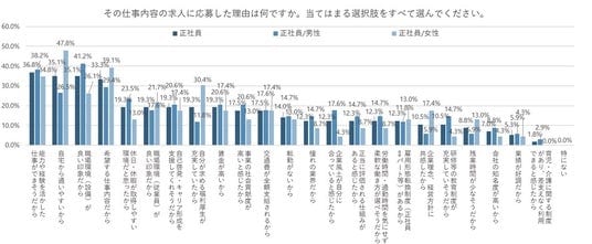 一方、「女性」のほうが「男性」よりも「自宅から通いやすいから」が21.3pt、「自分が求める福利厚生が充実していたから」が18.6pt、「企業理念、経営方針に共感したから」が11.5pt高くなった。特に通いやすさは約半数から支持されている。