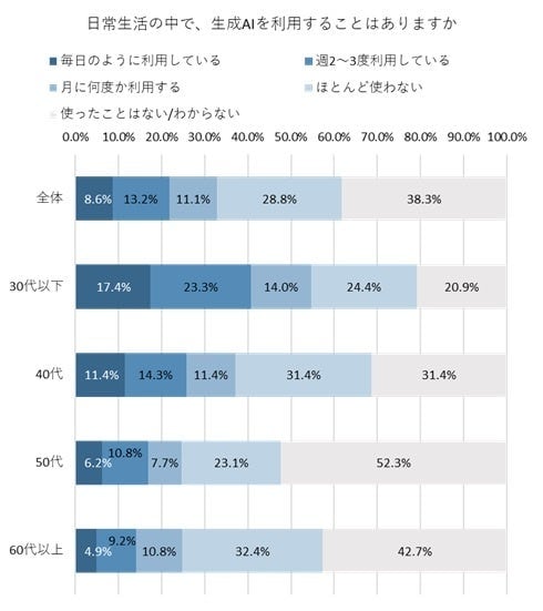 年代別にみると、年代が上がるにつれて、「毎日のように利用している」と回答した割合は低くなった。 また、「30代以下」では「毎日のように利用している」「週2~3度利用している」「月に何度か利用する」と回答した割合が他の年代よりも高く、日常の中でより多く生成AIに触れていることがわかった。
