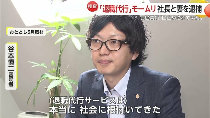 2024年5月、「SNSでもYouTubeでも退職代行の話は普通にあるものになってきたので、(退職代行サービスは)本当に社会に根付いてきた」とかつて取材で退職代行サービスの意義を語っていた「モームリ」運営会社の社長・谷本慎二容疑者(37)と、その妻で運営会社の幹部、志織容疑者(31)。