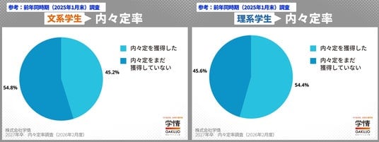 文理別にみると、理系が前月比+14.1ポイントの大幅増で60.4%となり、早くも6割を超えました。文系は前月比+9.6ポイント伸びましたが、前年同時期よりは2.5ポイント低い42.7%でした。