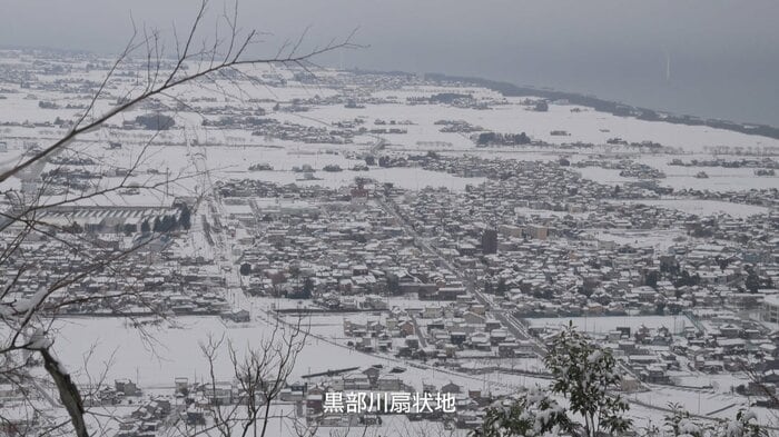 見晴らしの良い展望台からは、雪模様の天気であったものの、その切れ間に雪化粧した黒部川扇状地を眺めることができた。さらに30分ほど登ると、地元で奥馬鬣山と呼ばれるもう一つのピークに到達する。