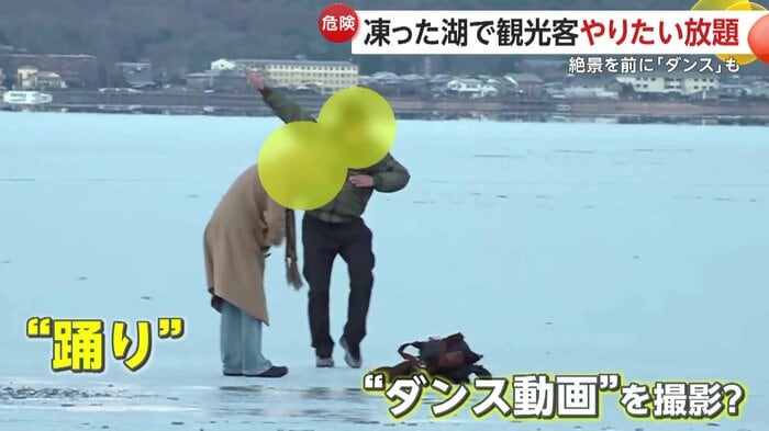 衝撃で氷が割れれば冷たい湖に落下し、命を落としかねない危険な行為だ。