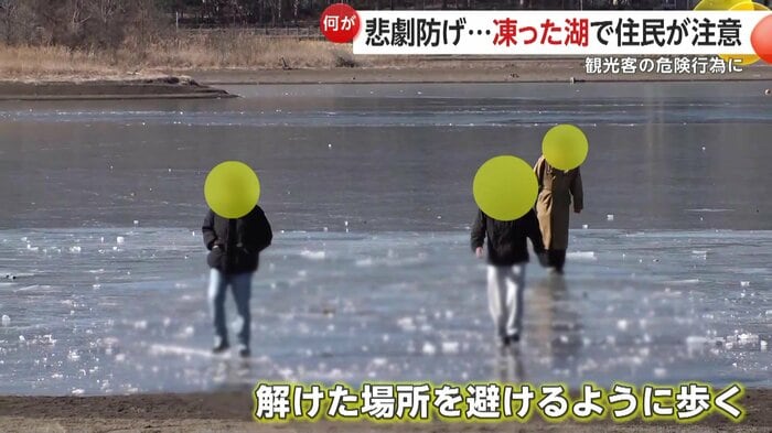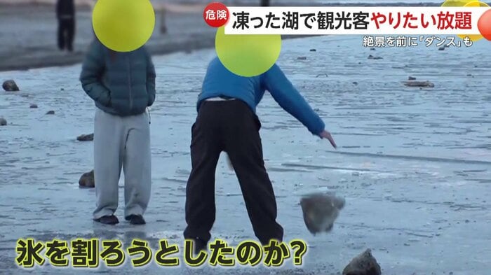 気温の上昇とともに凍っていた湖面が一部溶け出す中、観光客の危険行為は続いていた。
