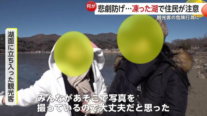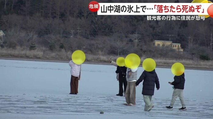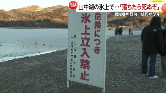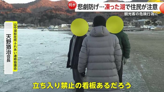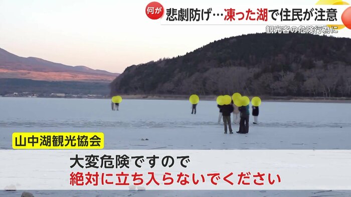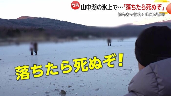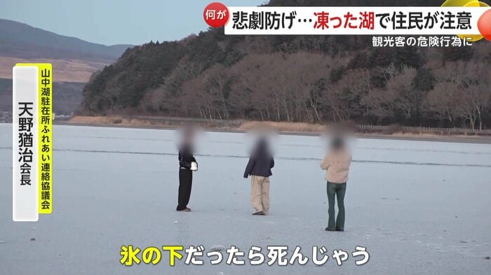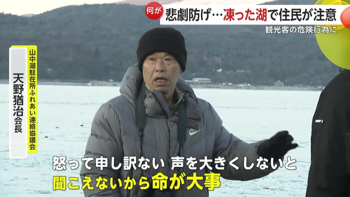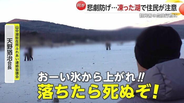 山中湖駐在所ふれあい連絡協議会の天野会長は「(氷は)薄い、厚さは5cmぐらい。だから落ちたら必ず心臓麻痺か、氷の下だったら死んじゃう。だから注意している、観光客は分からないから」と話す。