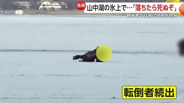 見かねた地元住民からは「おーい!氷から上がれ!!落ちたら死ぬぞ!」と怒鳴り声が上がる。
