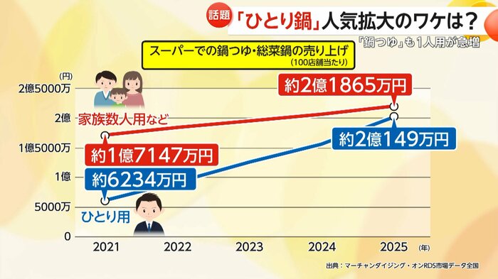 全国のスーパー100店舗あたりのひとり用の「鍋つゆ」や「鍋」の売り上げは、今や「数人用」を追い抜きそうなほどニーズが拡大している。