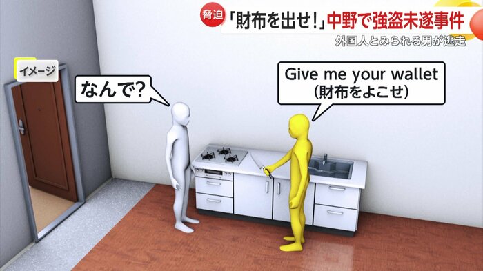 男は台所にあった包丁を手に取ると、「ギブ・ミー・ユア・ウォレット(財布をよこせ)」と要求したという。被害男性が、「なんで?」と返したが、男は「財布を出せ!」と繰り返し、英語とカタコトの日本語で2度にわたり脅迫を行った。2人は揉み合いになり、その後、男は包丁を置いて何も盗らずにその場から立ち去った。
