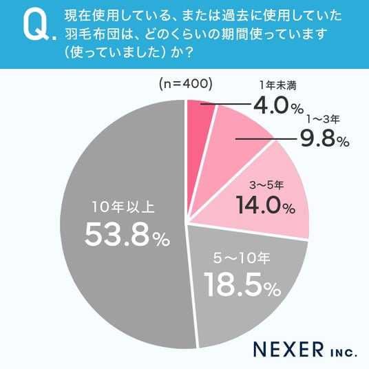 最も多かったのは「10年以上」で53.8%でした。続いて「5~10年」が18.5%、「3~5年」が14%となり、5年以上使用している人は全体の約7割を超えています。羽毛布団は長く愛用されているケースが多いことがわかります。
