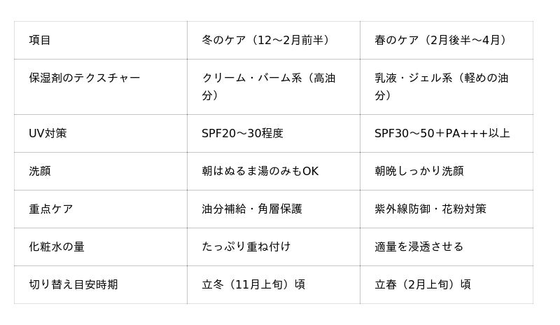 結論から言うと、冬から春へのスキンケア切り替えは「気温」ではなく「湿度」と「紫外線量」の変化を基準にすべきです。立春(2月4日頃)から紫外線量が急増し始めるため、この時期からUVケアの強化と保湿バランスの見直しが必要になります。調査では72.3%が季節の変わり目に肌荒れを経験しているにもかかわらず、正しい切り替えタイミングを理解している人はわずか18.7%でした。