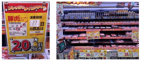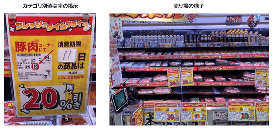 (上図)ダイナミックプライシング対象の精肉売り場値引きラベルを貼付しない代わりに、売り場に値引率の掲示やポップで自動値引の周知を実施。消費者は商品ラベルと値引きの掲示で割引率を判断。