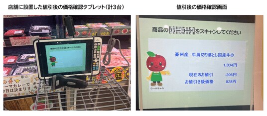 (上図)売り場に設置された価格確認用のタブレット売り場に設置したタブレットでバーコードを読み取らせると、いくら割引が受けられるか事前に把握できる。