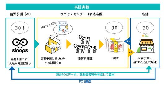 本実証実験は、こうしたサプライチェーンの構造上の課題に対し、ロッキーで採用されている需要予測型自動発注サービス「sinops-R」を、製造段階(川上)と販売段階(川下)の両面で活用することで、食品ロス削減と業務効率化の同時実現を目指しました。