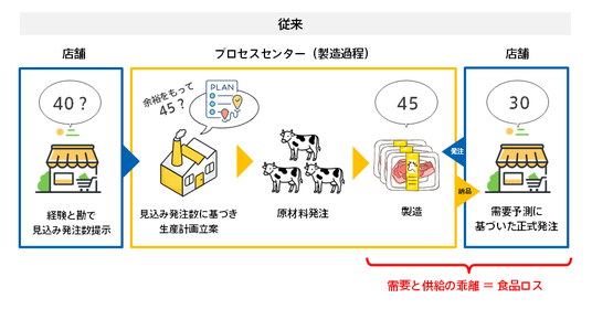 日本国内で発生する年間約464万トンの食品ロスのうち、約231万トンは事業者から排出されています*²。食品ロスを抜本的に削減するには、てまえどりやフードドライブといった店舗での対策だけでなく、製造プロセスまで遡った取り組みが不可欠であり、その鍵となるのが需要予測技術です。