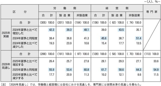 労働側282人、経営側119人、専門家114人の合計515人。ただし、「(3)26年夏季賞与・一時金の見通し」については、労働側305人、経営側136人、専門家113人