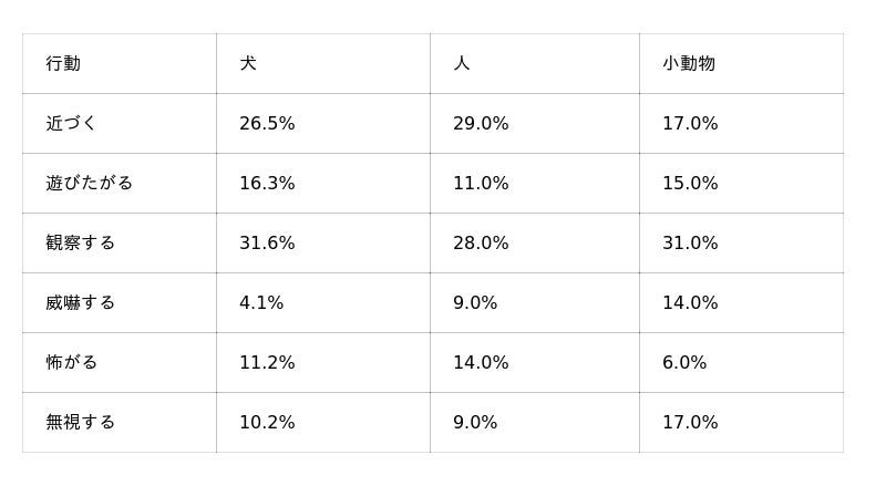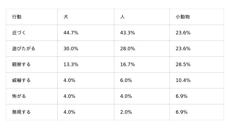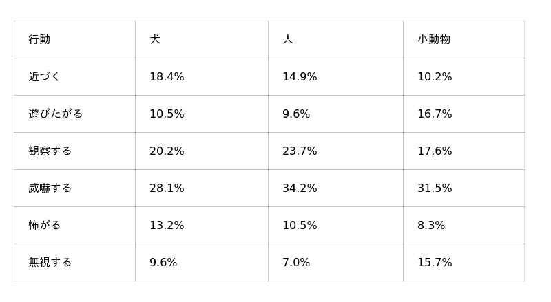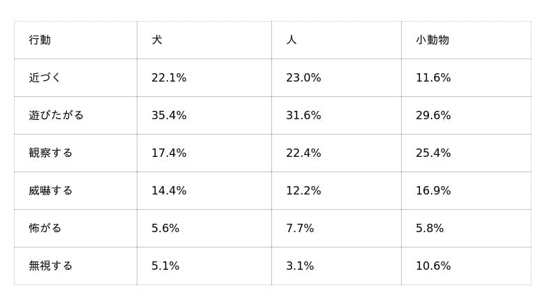 また、犬や人に対しては、「近づく」(犬18.4%、人14.9%)が3番目に多く、慎重でありながらも、一定数が距離を縮める行動に出ることがわかります。一方、小動物に対しては、「遊びたがる」(16.7%)が続き、興味を示す個体がいる点が特徴的です。