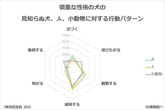 これらの性格別に、見知らぬ犬、人、(猫や鳥のような)小動物に対する反応として最も当てはまるものの回答を集計しています。