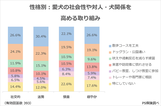 一方、「特にしていない」(14.4%)も見られ、すでに人やほかの犬との交流に慣れており、特別な工夫を必要としていない飼い主もいると考えられます。全体として、社交的な犬は外の環境を活かした取り組みが目立ち、他の性格と比べても交流機会を重視する傾向が強く表れています。