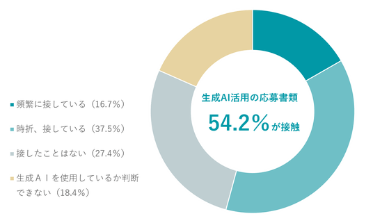 採用選考において、応募者が生成AIを使用したと思われる書類や回答に接したことがあるか調査したところ、54.2%が「接している」(頻繁に接している:16.7%、時折、接している:37.5%)と回答しました。 生成AIの活用が社会全体で広がる中、採用の現場においても、応募書類や選考過程で生成AIを用いたとみられる表現や回答に接する機会が、すでに過半数の企業で発生している実態が明らかになりました。