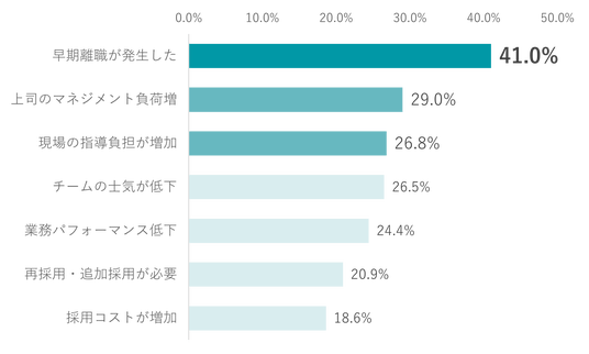 採用ミスマッチによって、実際に発生した影響について調査したところ、最多回答は「早期離職が発生した(41.0%)」、次いで「上司のマネジメント負荷増(29.0%)」、「現場の指導負担が増加(26.8%)」と続きました。採用時の見極め不足が、離職だけでなく現場全体の負荷増加につながっている実態が明らかになりました。