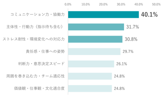 さらに、書類選考や面接といった一般的な採用プロセスでは把握しづらく、入社後にギャップを感じやすい応募者情報について尋ねたところ、最多回答は「コミュニケーション力・協働力(40.1%)」、次いで「主体性・行動力(指示待ち含む)(31.7%)」、「ストレス耐性・環境変化への対応力(30.8%)」と続きました。
