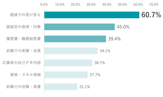 現在の採用選考において、最終的な採用判断に依存している情報について調査したところ、最多回答は「面接での受け答え(60.7%)」、次いで「面接官の直感・印象(45.0%)」、「履歴書・職務経歴書(39.4%)」と続きました。採用判断が面接時の限られた情報や主観に依存していることが、ミスマッチ発生の一因となっている可能性がうかがえます。