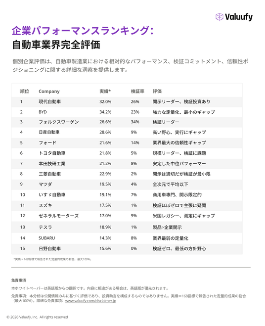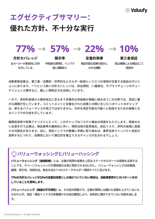 本自動車業界分析は、ValuuCompassを用いた一連の業界レポートの第一弾です。Valuufyは2026年を通じて、コミットメントと検証済み実績のギャップがポートフォリオにとって重大なリスクとなり、企業に評判面でのエクスポージャーを生む業界を対象に、セクター別評価を発表していく予定です。