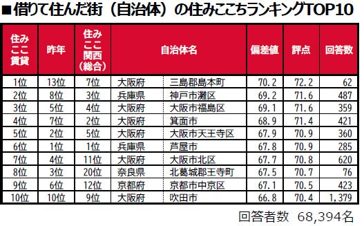 借りて住んだ街(自治体)の住みここちランキング2025<関西版>1~50位