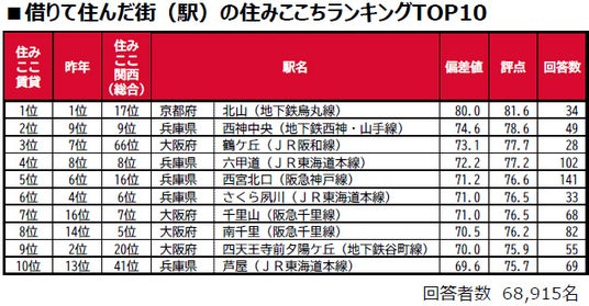 ■「借りて住んだ街(駅)の住みここち」トップは、 2年連続で北山
