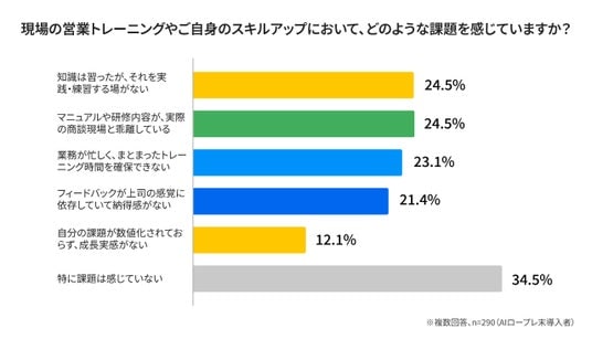 一方で、AIロールプレイングをまだ利用していない人に現場の営業トレーニングや自身のスキルアップにおける課題を聞いたところ、「知識は習ったが、それを実践・練習する場がない」(24.5%)、「マニュアルや研修内容が、実際の商談現場と乖離している」(24.5%)、「フィードバックが上司の感覚に依存していて納得感がない」(21.4%)といった回答が挙げられました。知識を習得しても試す機会が不足している点や、評価基準の曖昧さが課題となっています。