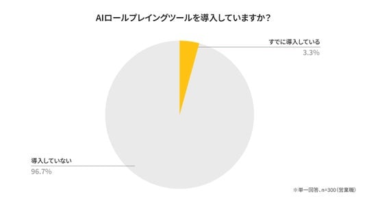 現状「AIロールプレイングをすでに利用している」と回答したのは全体のわずか3.3%にとどまり、96.7%はAIロールプレイング未導入でした。なお、AIロールプレイングをすでに利用している人の8割が、現場の営業トレーニングや自身のスキルアップに「特に課題を感じていない」と回答しており、AI活用が現場の課題解決や、満足度の高いトレーニング環境の構築に寄与していることが分かりました。