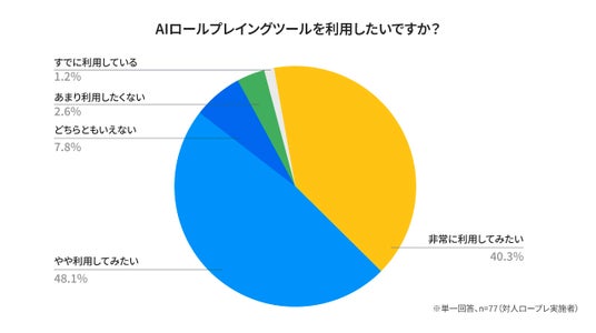 現在「対人ロールプレイングを行っている」人のうち、88.4%が「AIロールプレイングを非常に利用してみたい・やや利用してみたい」と回答しました。営業トレーニングを実践している層において、気兼ねなくいつでもどこでも練習できる相手として、AIロールプレイングツールの利用意向が高いことが分かりました。