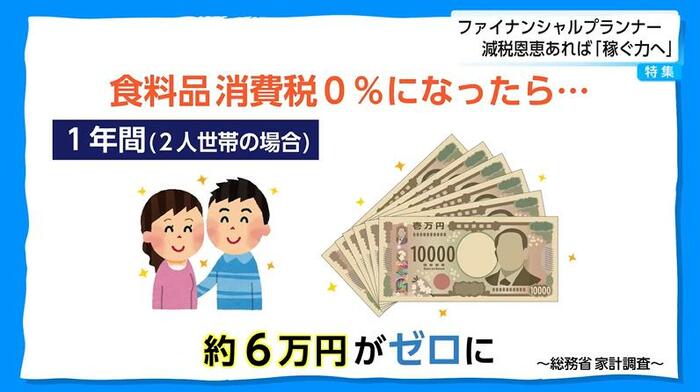 二宮さんは「ざっくり、年で6万円くらいは家計が楽になる」と分析する。総務省の家計調査で2人世帯の食料品支出から見た場合の減税効果である。