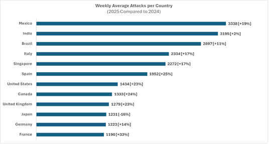 サイバー攻撃の手法と構造の変化におけるサイバーセキュリティ業界の主要な傾向を明らかに 日本は2024年比16%減となる週平均1231件の攻撃を受け上位12カ国中10位