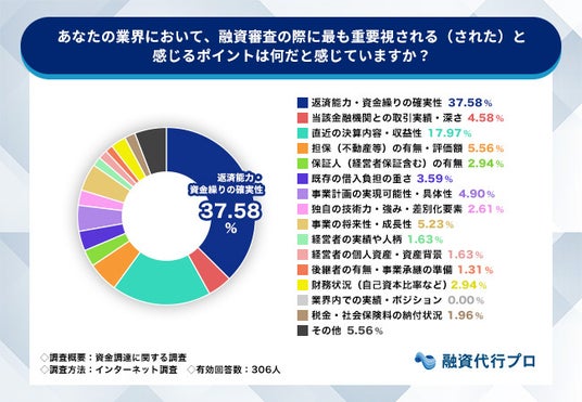 株式会社融資代行プロが実施した「資金調達に関する調査」では、「融資審査の際に最も重要視される(された)と感じるポイント」を尋ねたところ、「返済能力・資金繰りの確実性」が37.6%で最多となりました。